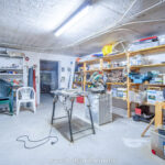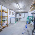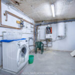 The basement level contains a large space divided into a workshop and storage area, where the gas boiler is installed. On the ground floor, an entrance hall leads to a bright open-plan living room with kitchen and dining area, opening directly to a veranda at the rear garden. A guest bathroom completes this level.